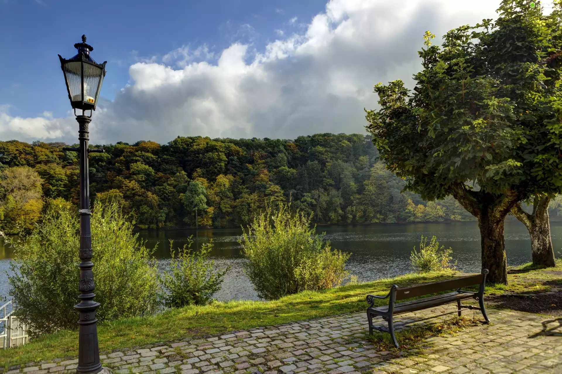 Zdjęcie Rzeka, Drzewa, Ławka, Latarnia, Jesień