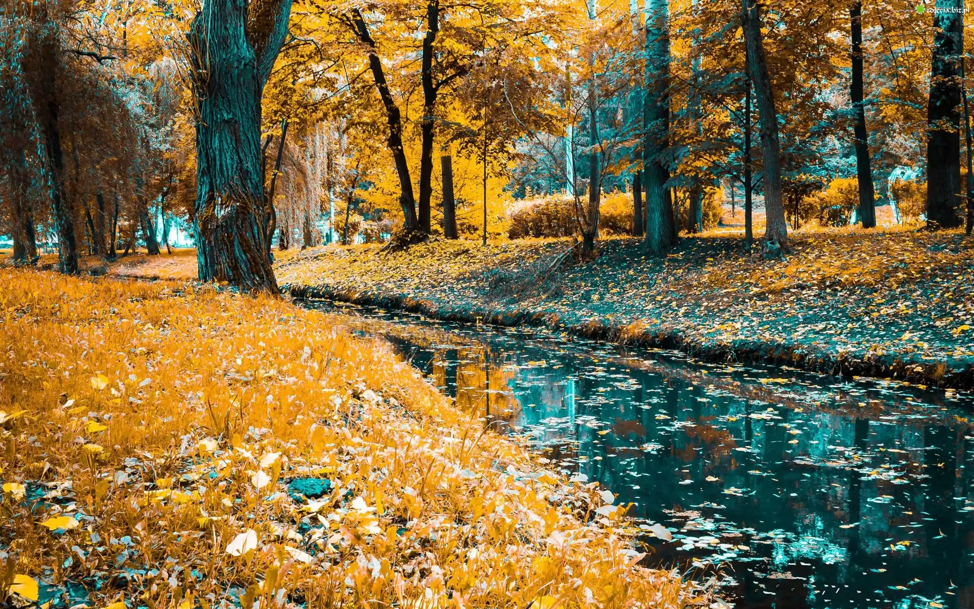 Zdjęcie Rzeka, Park, Drzewa, Liście, Jesień