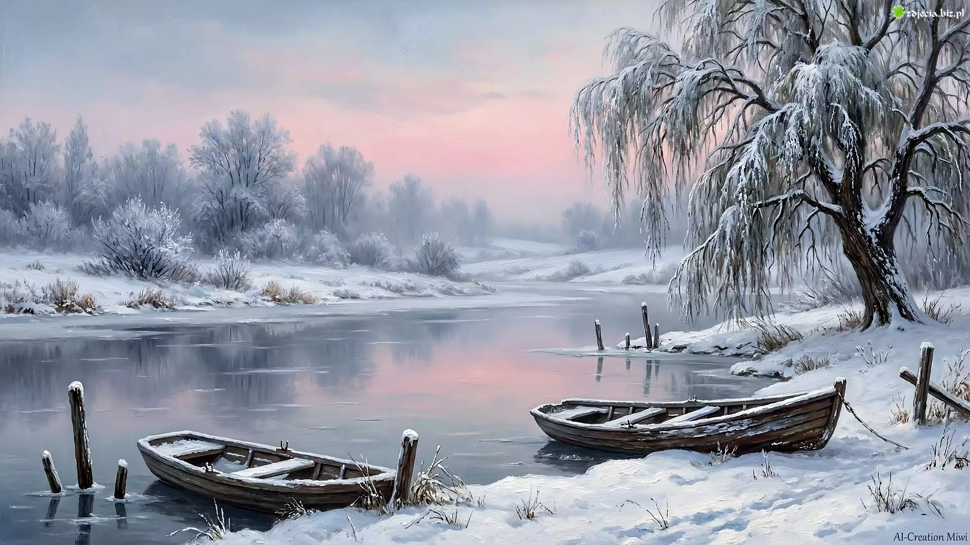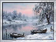 Zdjęcie Zima, Dwie, Łódki, Rzeka, Drzewa, Grafika AI