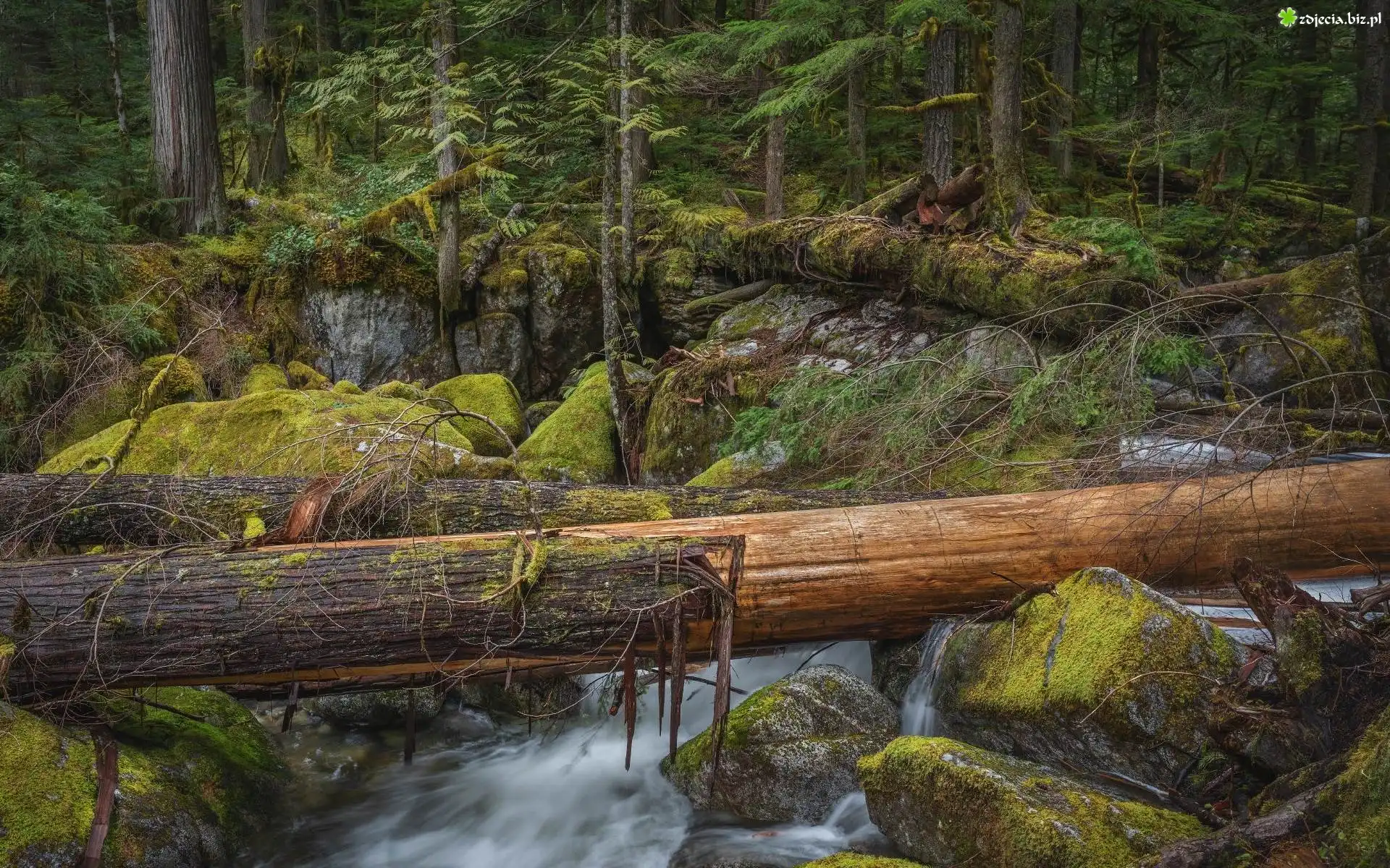 Zdjęcie Las, Powalone, Drzewa, Rzeka, Kamienie, Mech