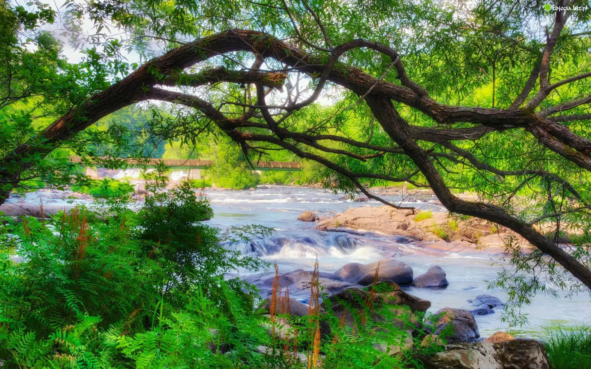 Zdjęcie Rzeka, Kamienie, Paprocie, Most, Wiosna