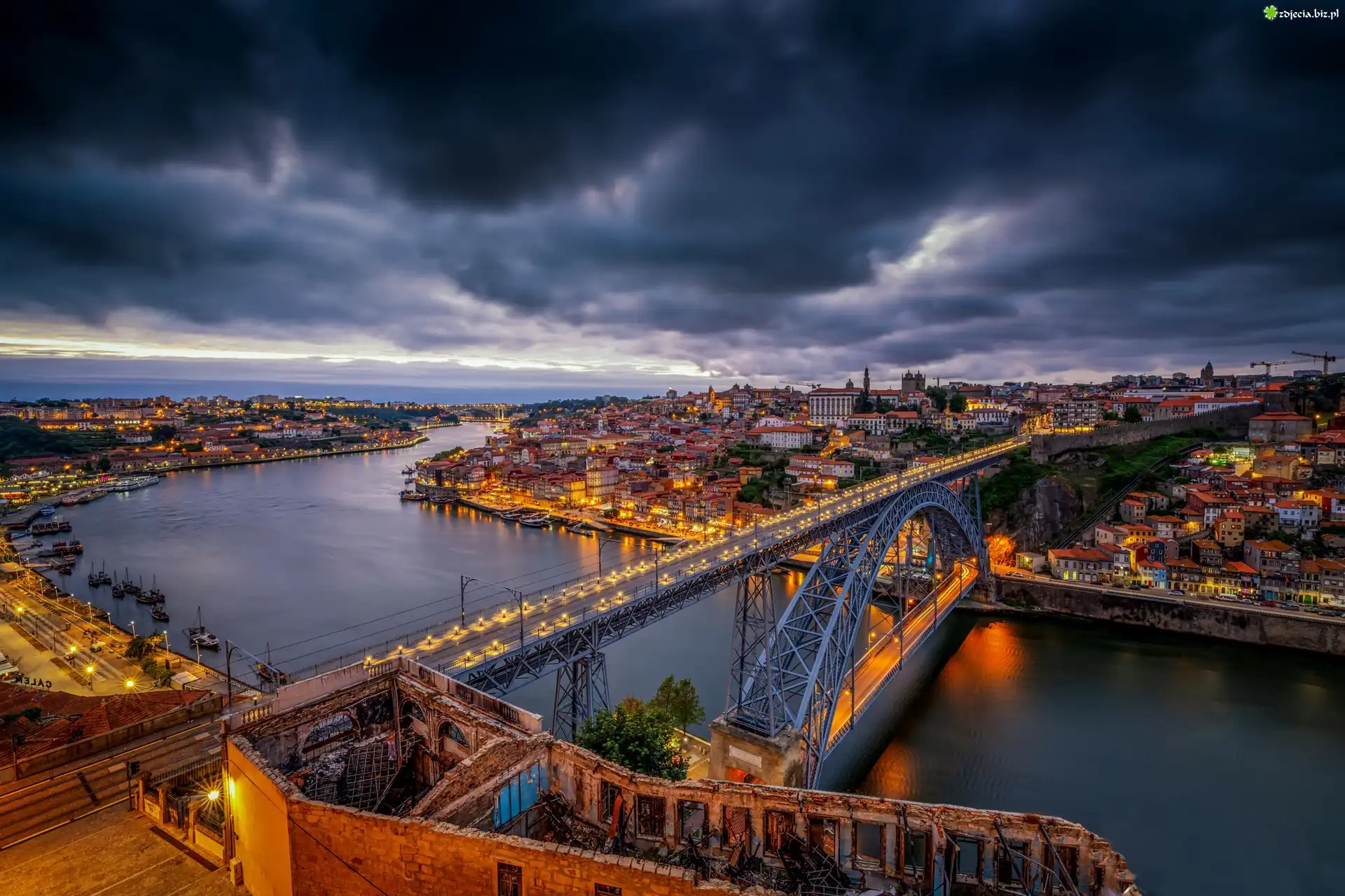 Zdjęcie Portugalia, Porto, Rzeka Duero, Most Ponte Dom Luis I, Ciemne, Chmury