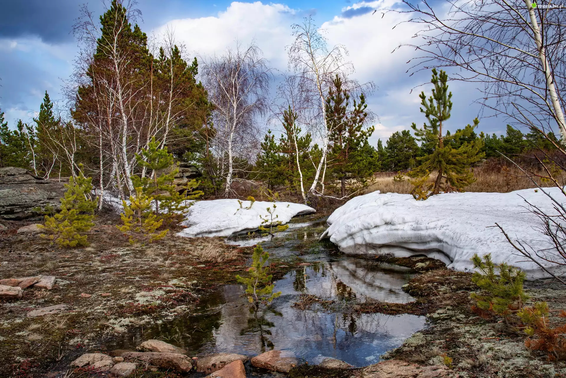 Zdjęcie Rzeka, Drzewa, Sosny, Brzozy, Śnieg, Zima