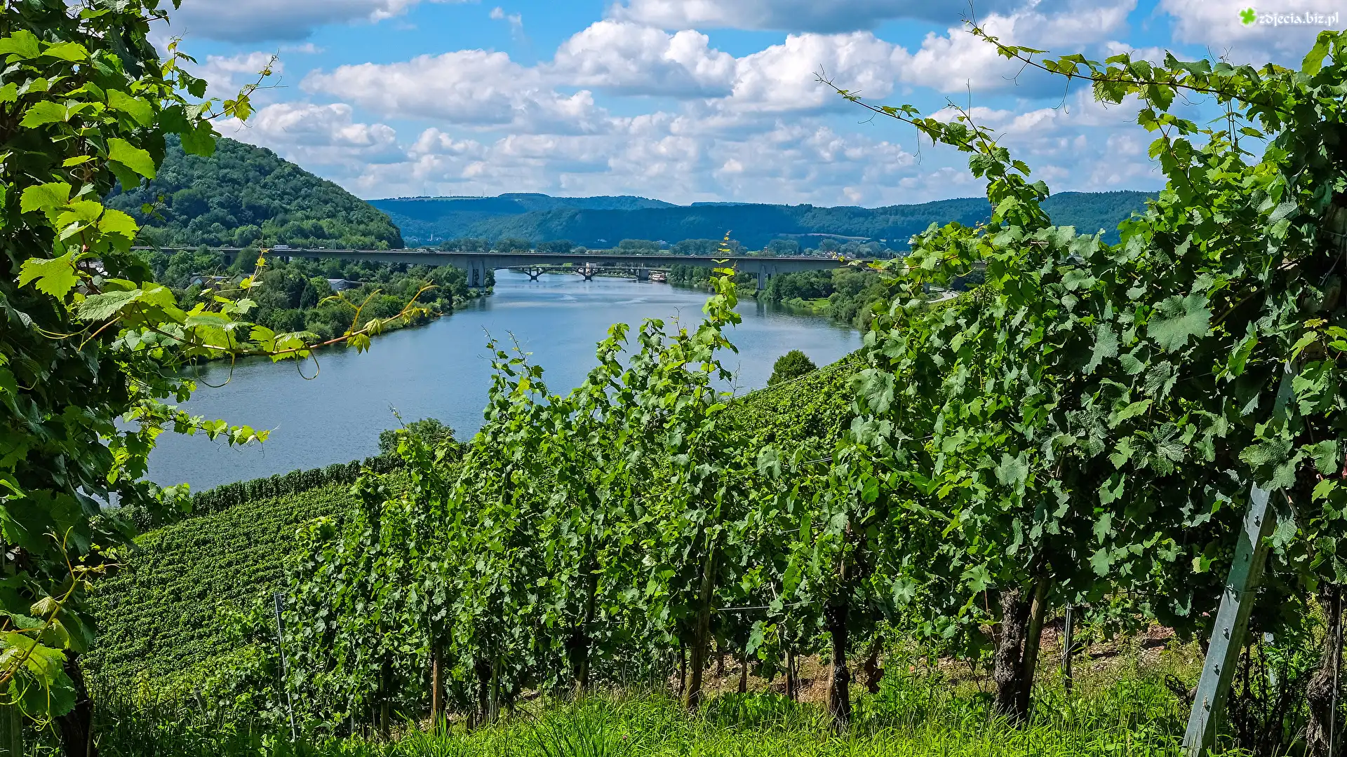 Zdjęcie Niemcy, Rzeka Mozela, Most, Wzgórza, Winnice, Winorośla