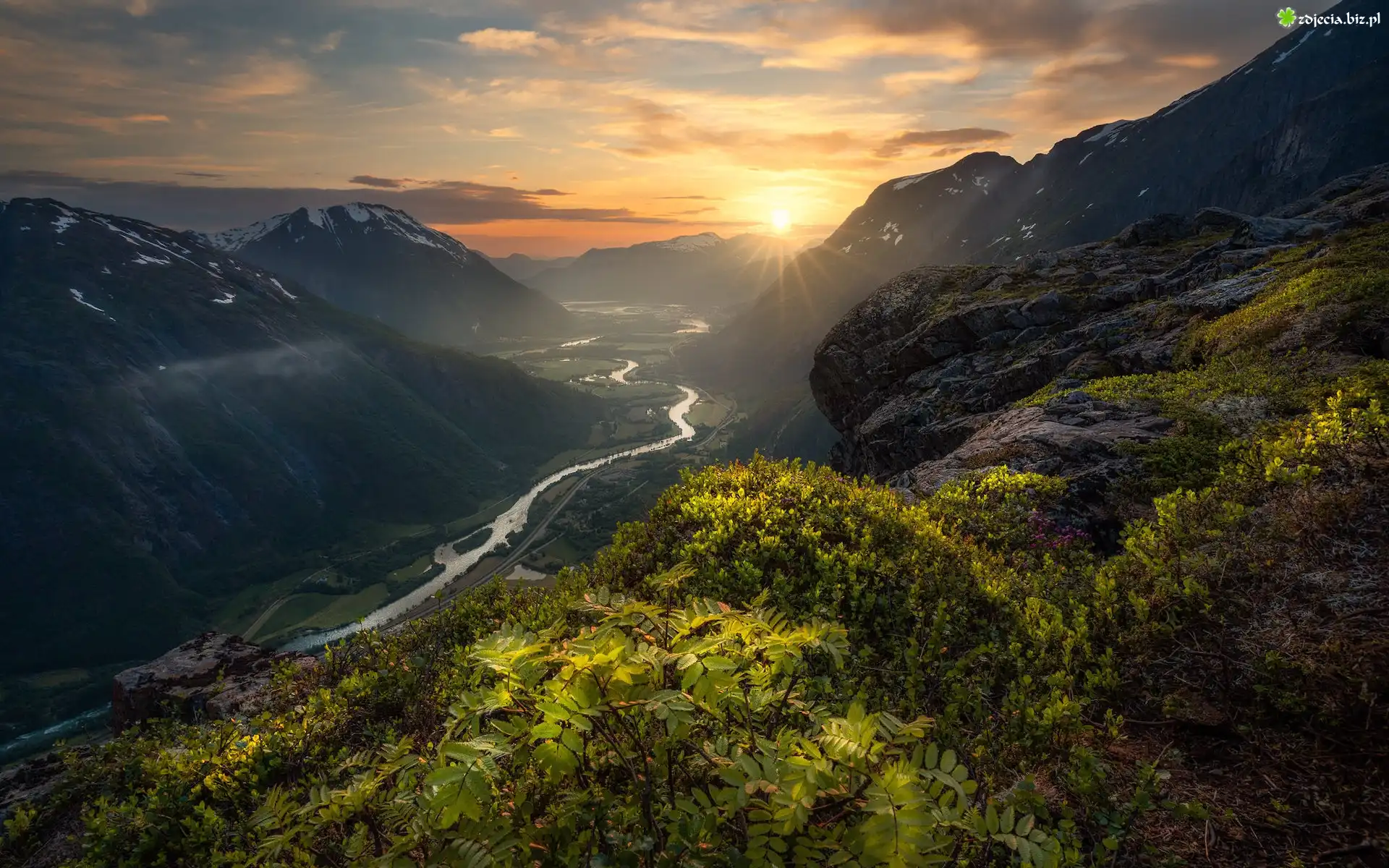 Zdjęcie Góry, Rzeka Rauma, Zachód słońca, Dolina, Romsdalen, Norwegia