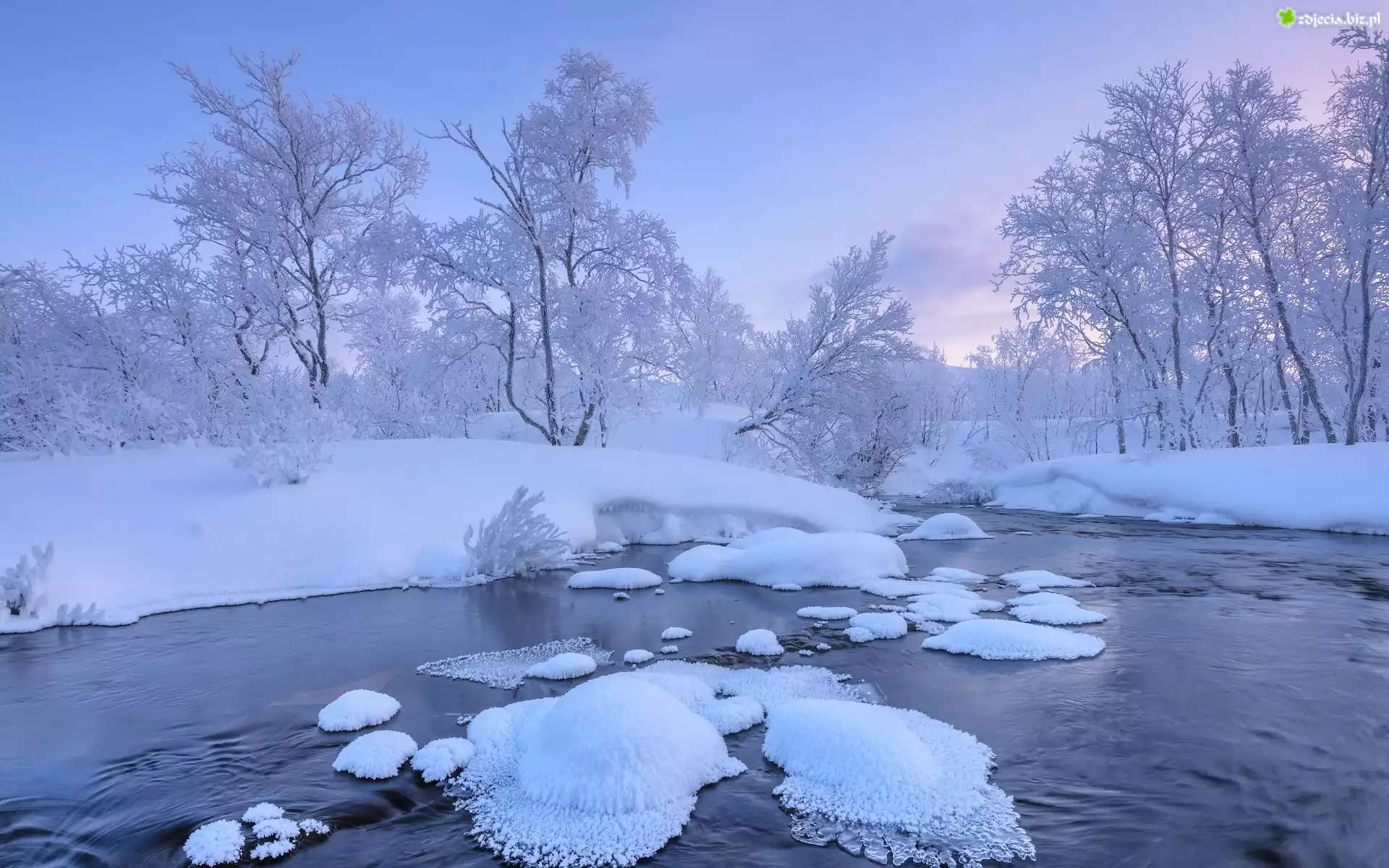 Zdjęcie Zima, Rzeka, Ośnieżona, Śnieg, Drzewa