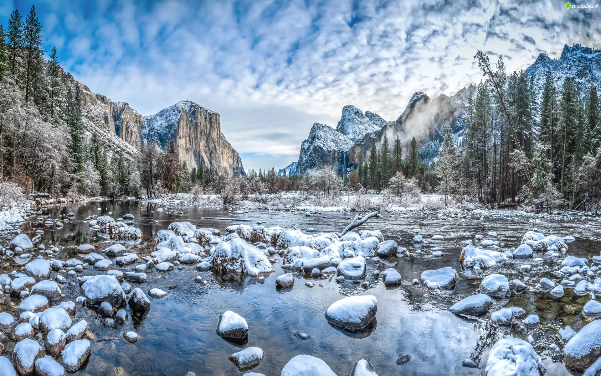 Zdjęcie Park Narodowy Yosemite, Góry, Rzeka Merced River, Kamienie, Śnieg, Zima, Stan Kalifornia, Stany Zjednoczone |