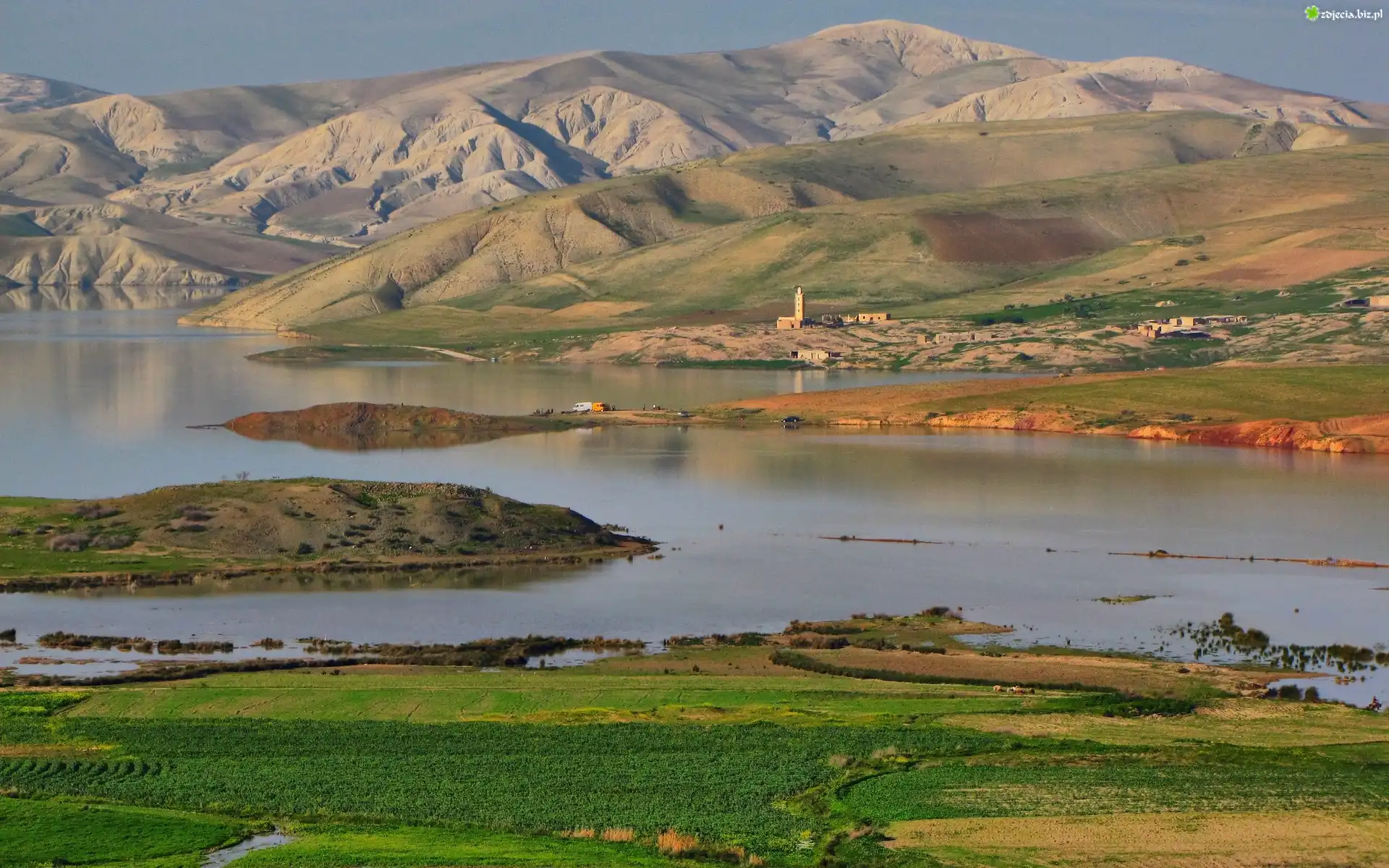 Zdjęcie Rzeka, Góry, Pola, Domy
