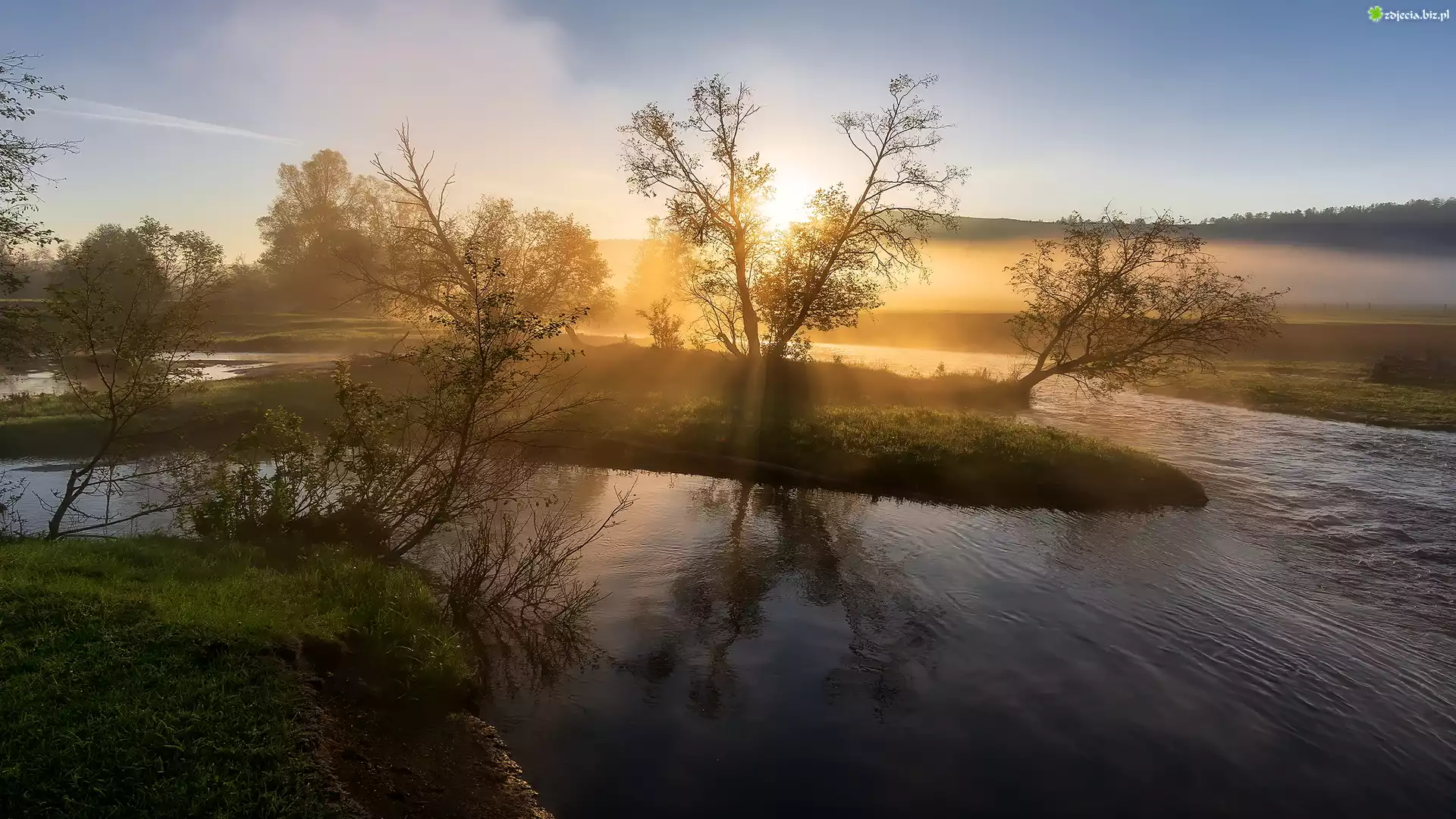 Zdjęcie Rzeka, Drzewa, Wschód słońca, Poranek, Mgła