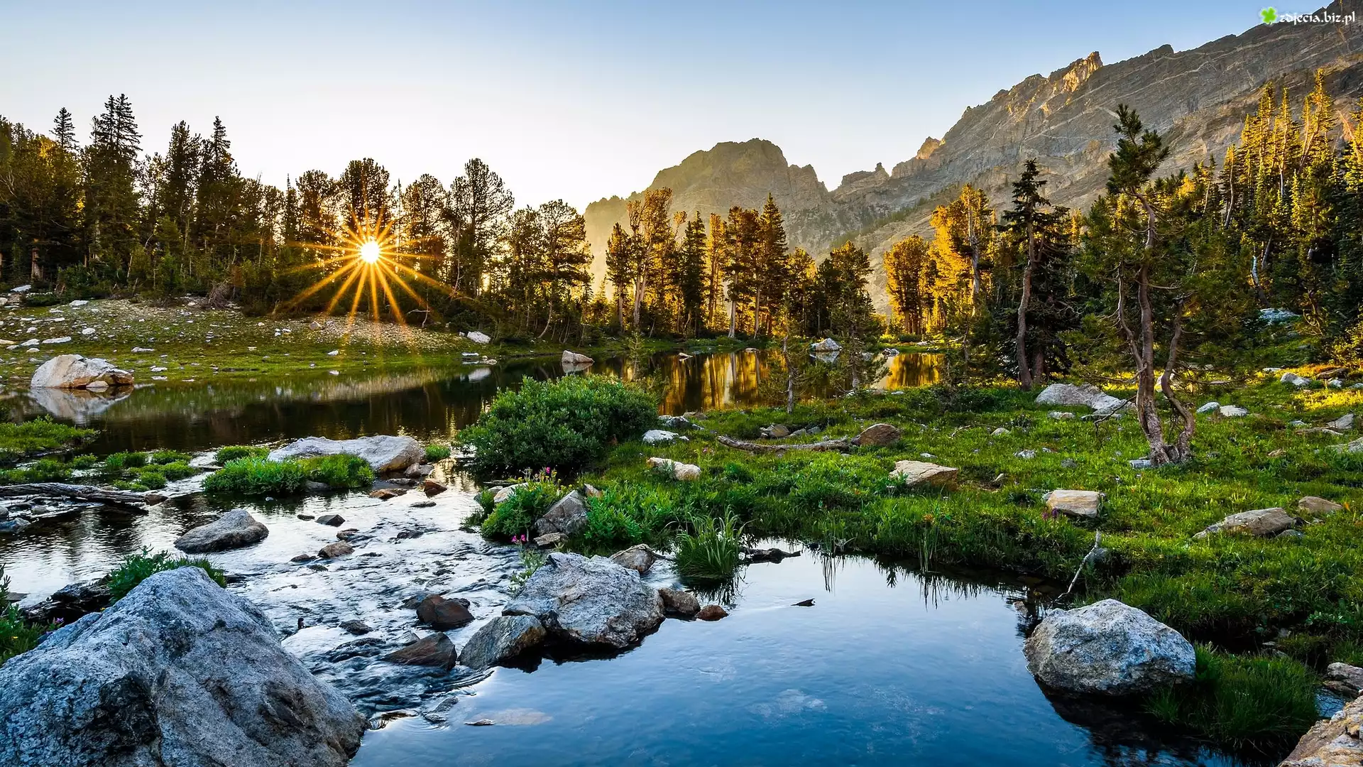 Zdjęcie Rzeka, Góry, Drzewa, Kamienie, Promienie słońca