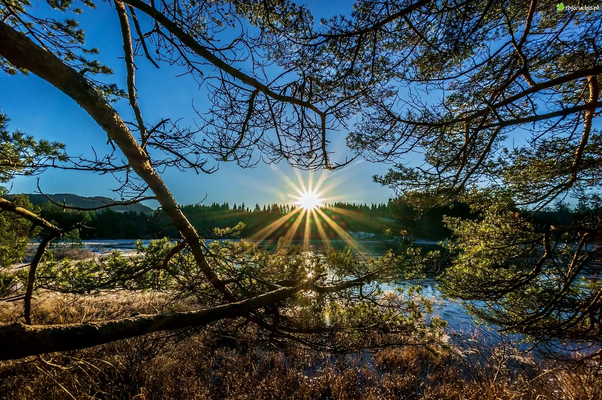 Zdjęcie Rzeka, Drzewa, Promienie, Słońca