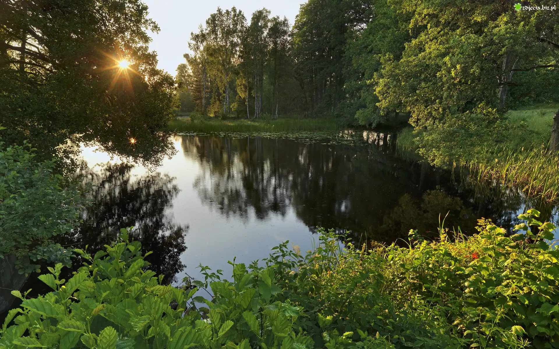Zdjęcie Rzeka, Las, Krzewy, Promienie, Słońca