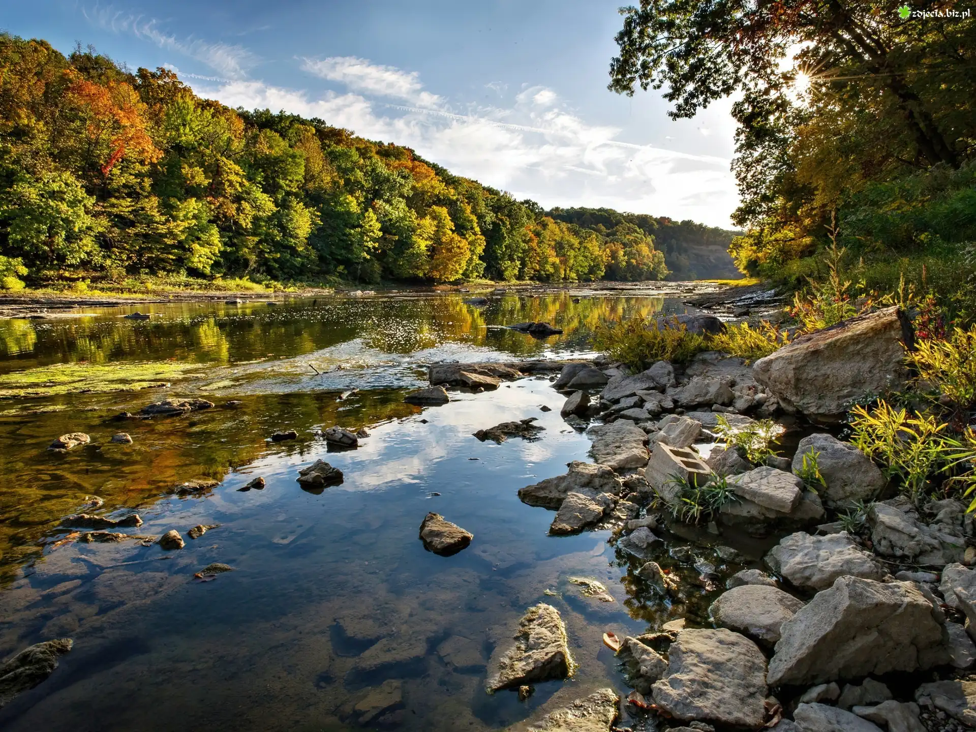 Zdjęcie Rzeka, Kamienie, Las, Promienie, Słońca