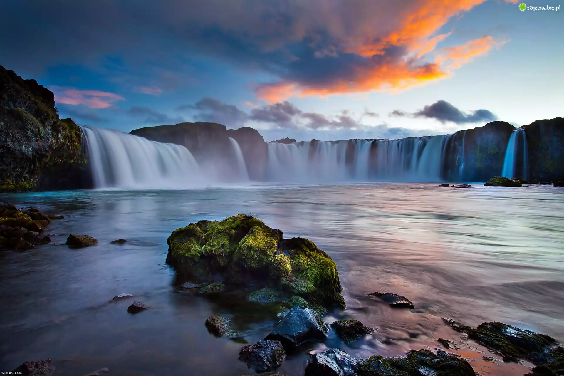Zdjęcie Rzeka, Skały, Wodospad, Chmury, Przebijające, Światło