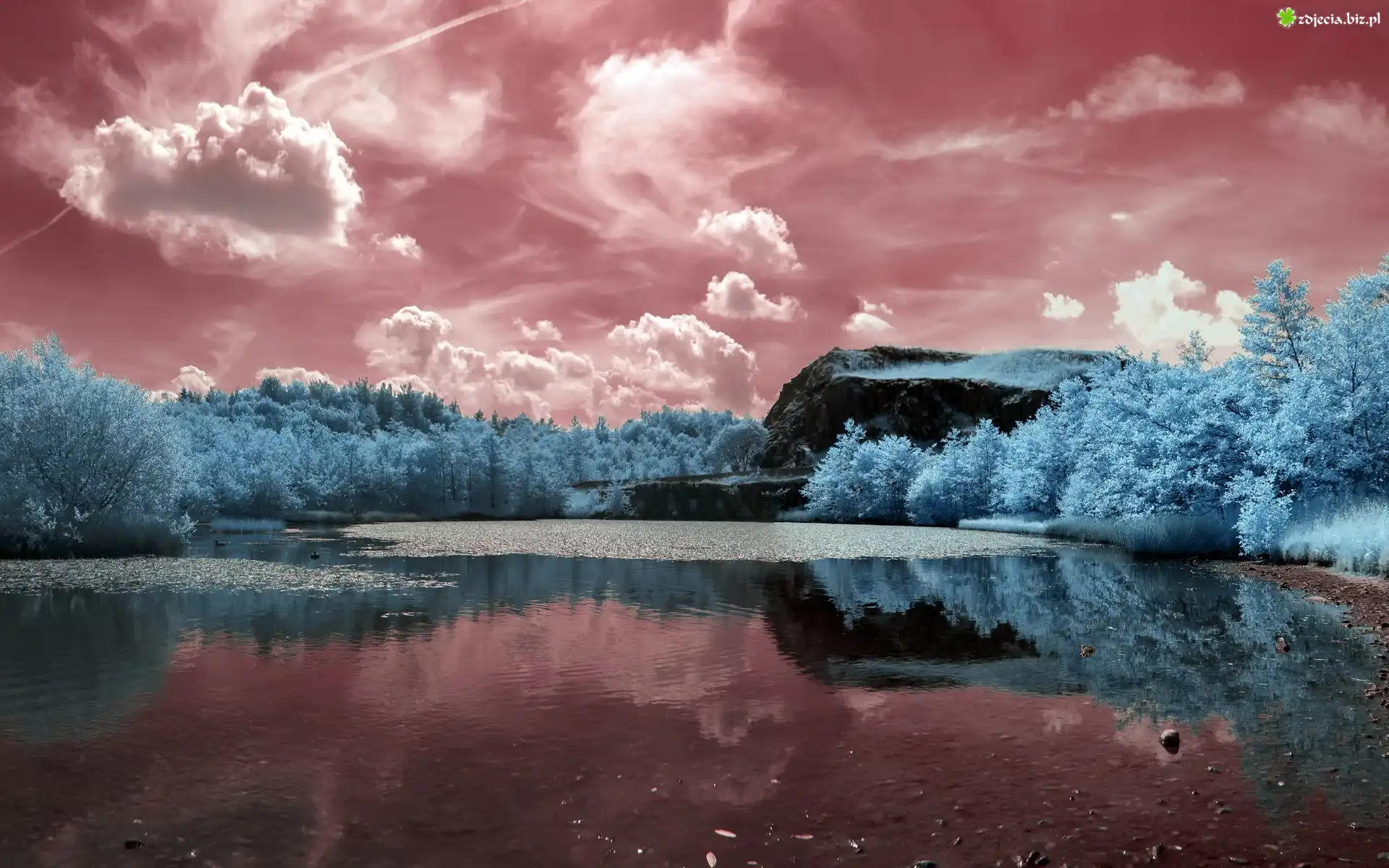 Zdjęcie Rzeka, Drzewa, Skała, Chmury