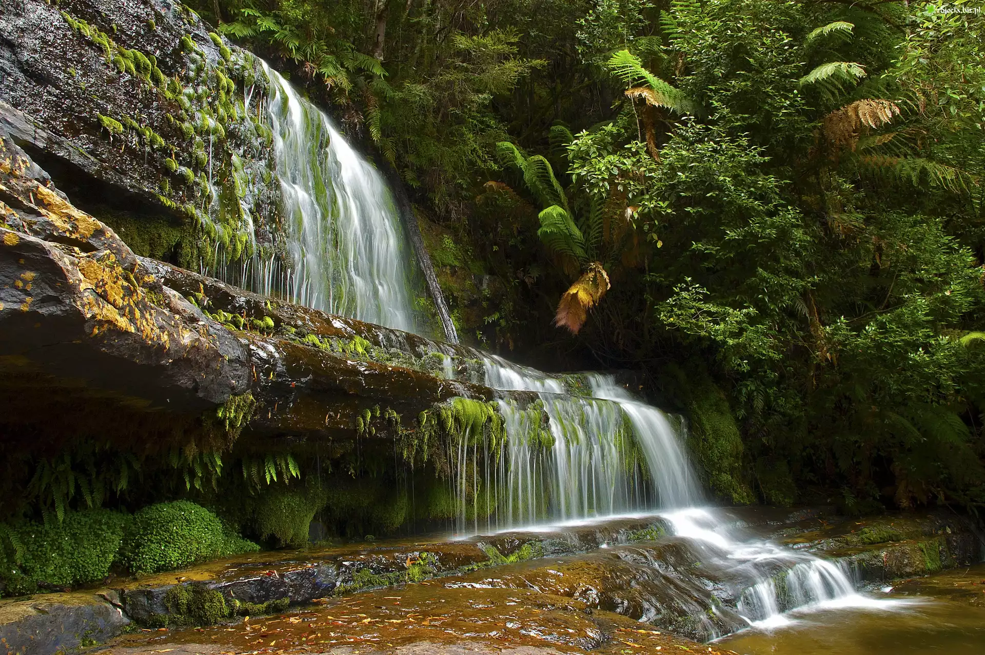 Zdjęcie Rzeka, Wodospad, Skały, Drzewa