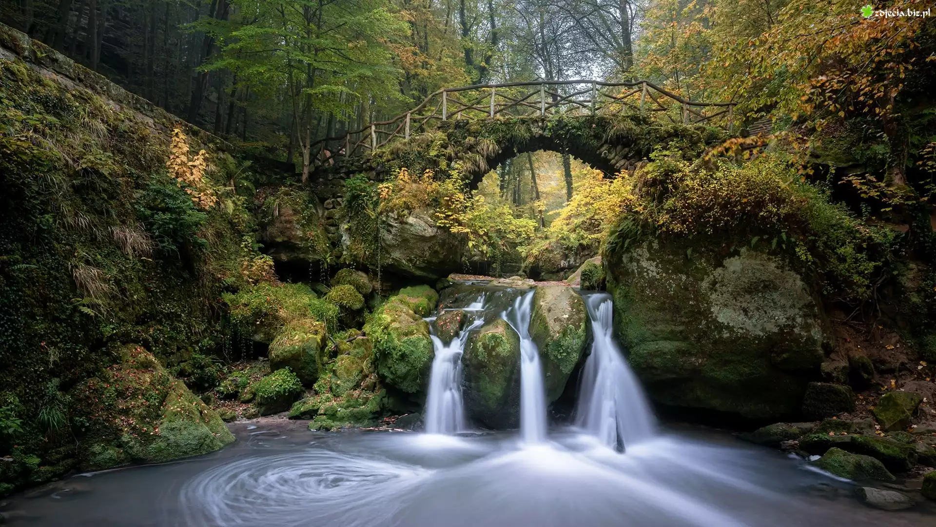 Zdjęcie Wodospad Schiessentumpel, Rzeka, Most, Skały, Drzewa, Las, Mała Szwajcaria, Mullerthal, Luksemburg |