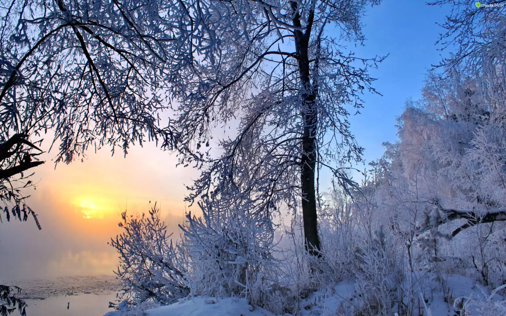 Zdjęcie, Rzeka, Mgła, Drzewa, Wschód, Słońca, Zima