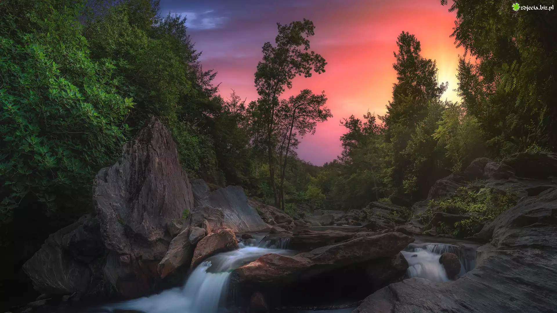 Zdjęcie Rzeka, Skały, Las, Zachód słońca, Kamienie