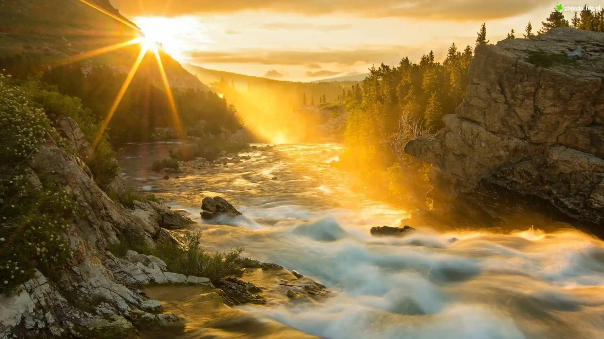 Zdjęcie Rzeka, Góry, Skały, Promienie, Słońca, Jesień