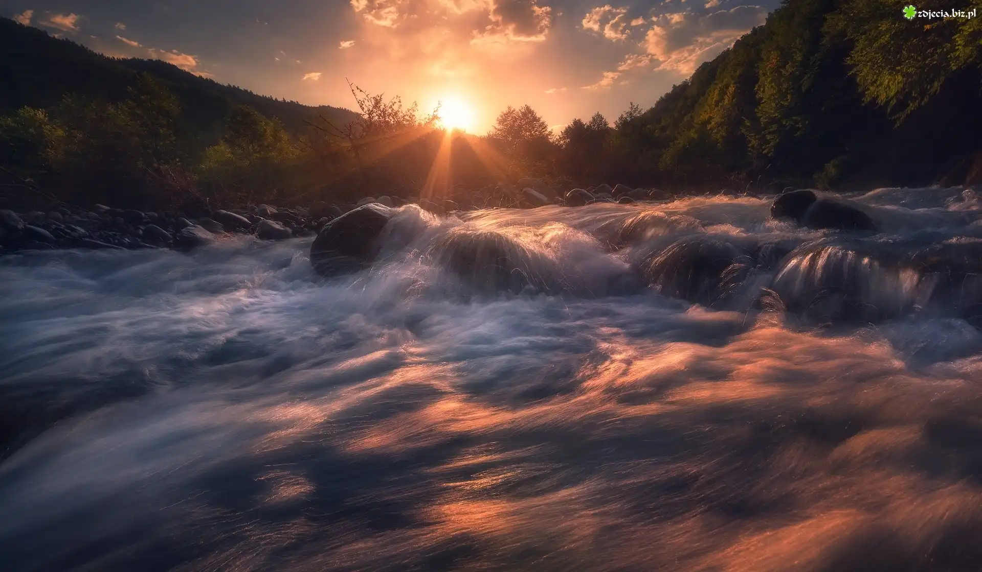 Zdjęcie Rzeka, Kamienie, Wschód słońca, Las