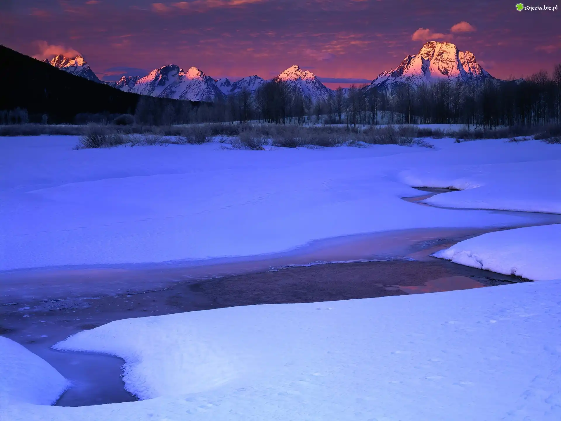 Zdjęcie Rzeka, Góry, Oświetlone, Szczyty, Zima