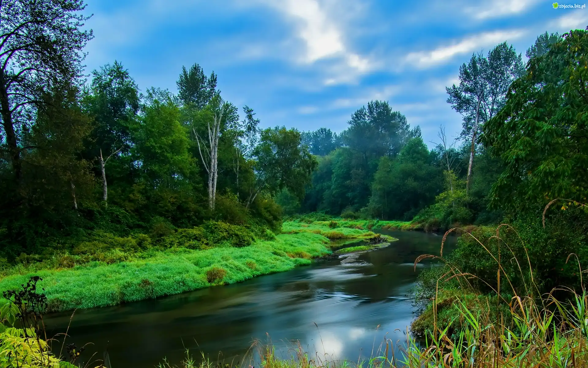 Zdjęcie Rzeka, Las, Trawy, Chmury