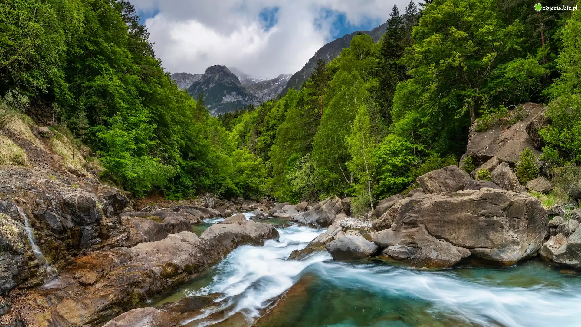 Zdjęcie Hiszpania, Aragonia, Rezerwat przyrody, Posets Maladeta, Drzewa, Rzeka, Rio Ara, Skały, Wąwóz, Valle de Bujaruelo |
