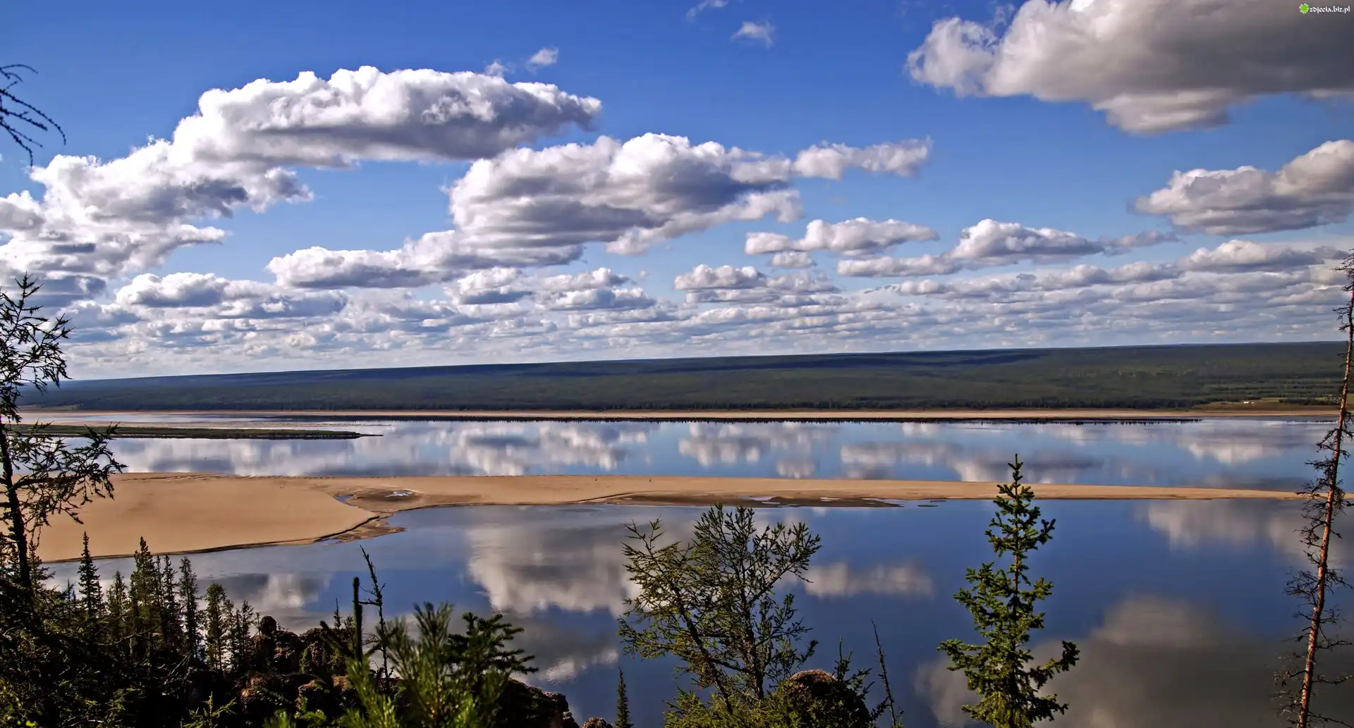 Zdjęcie Rzeka, Chmury, Wierzchołki, Drzew
