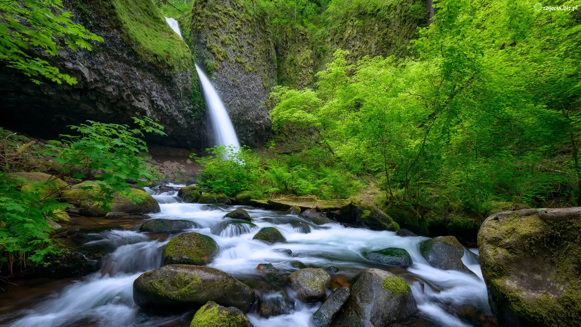 Zdjęcie Wodospad, Upper Horsetail Falls, Rzeka, Skały, Kamienie, Zielone, Krzewy, Rośliny, Oregon, Stany Zjednoczone |