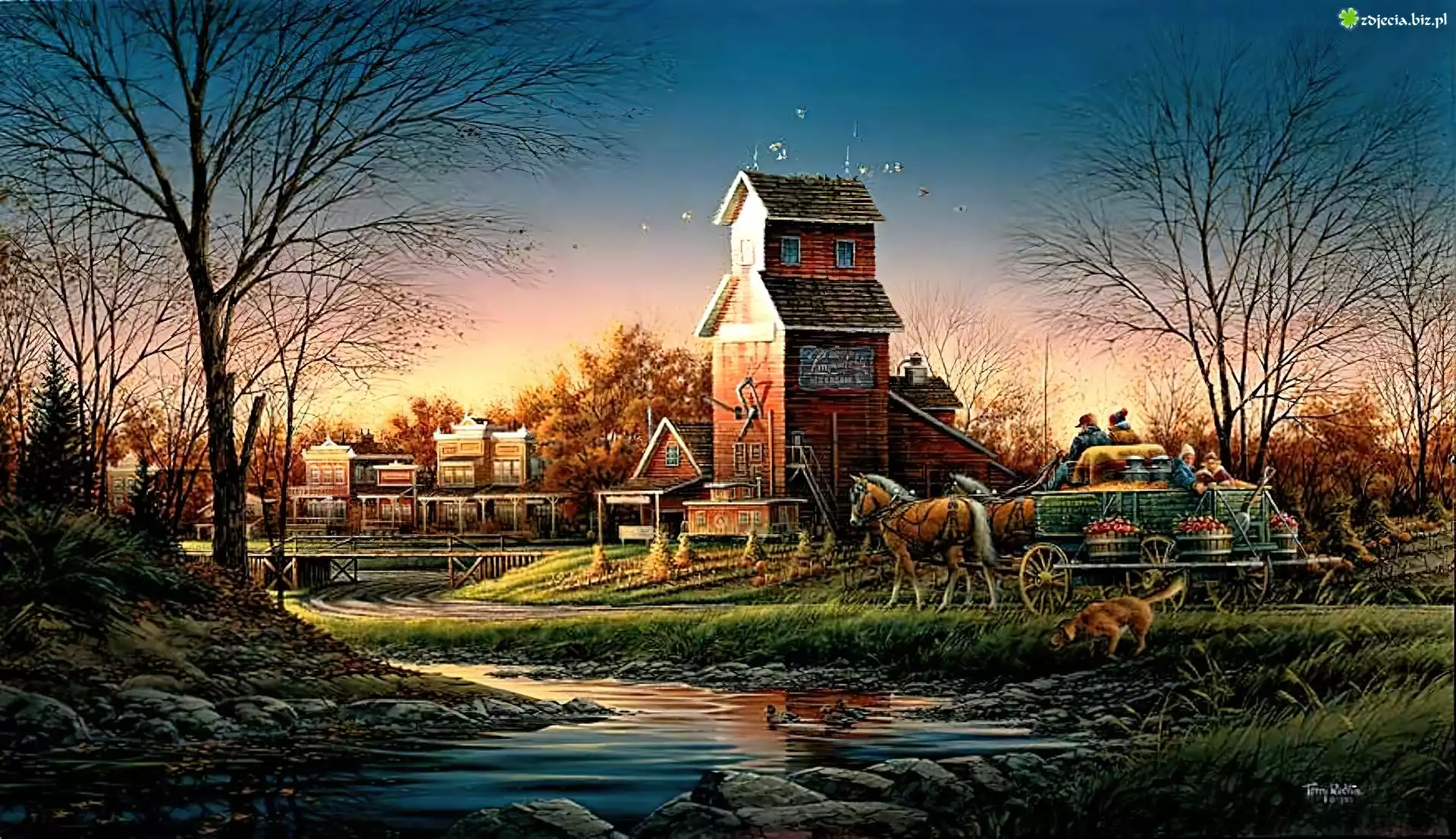 Zdjęcie, Rzeka, Domy, Wóz, Konny
