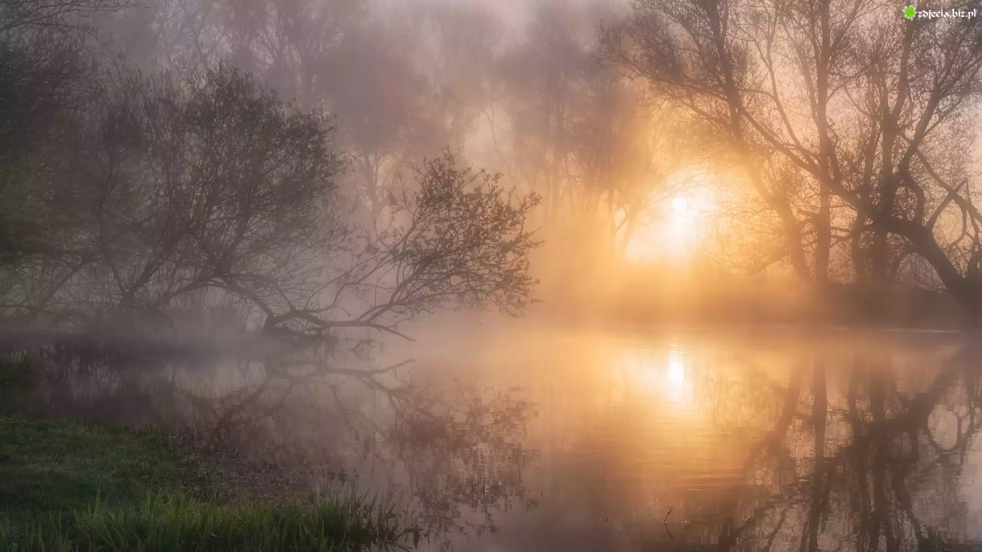 Zdjęcie Rzeka, Pochylone, Drzewa, Mgła, Wschód słońca