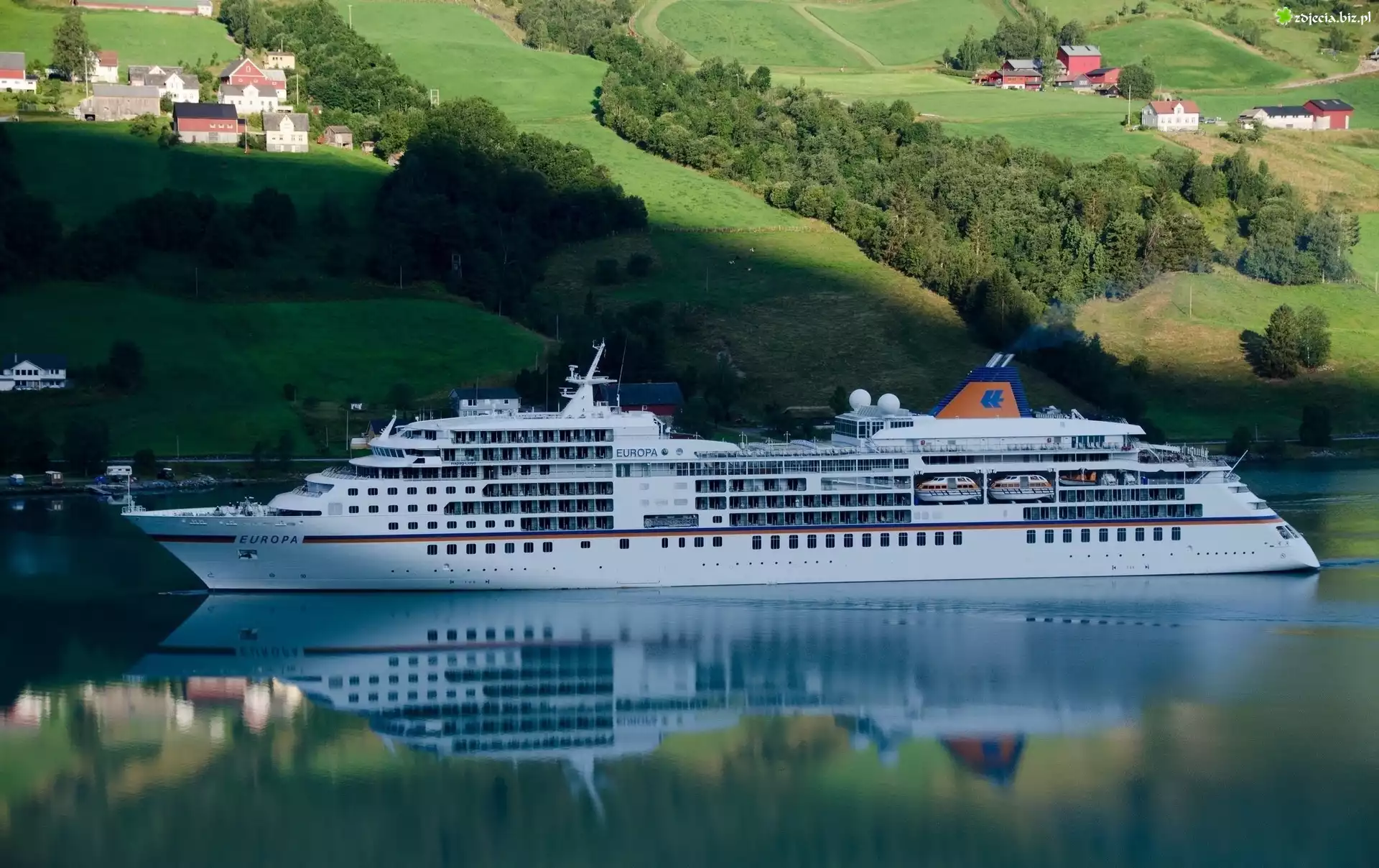Zdjęcie Rzeka, Statek, Pasażerski, Wzgórza, Domy