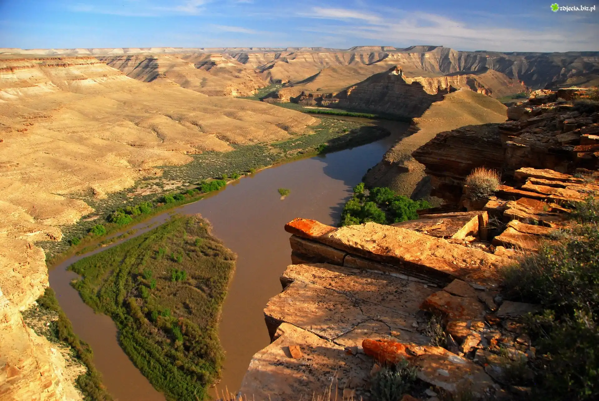 Zdjęcie Rzeka, Skały, Wzgórza, Niebo