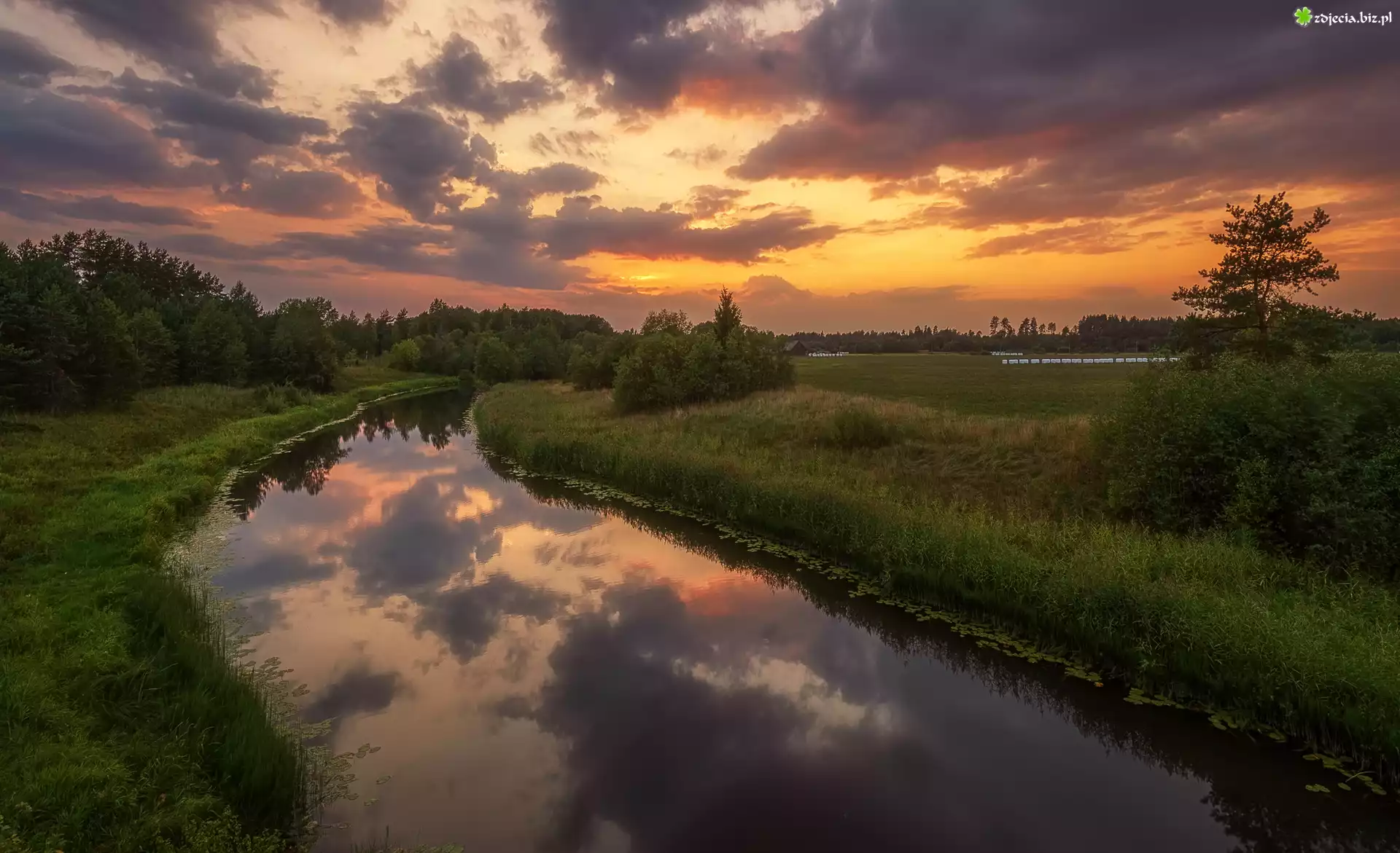 Zdjęcie Rzeka, Drzewa, Chmury, Odbicie, Zachód słońca