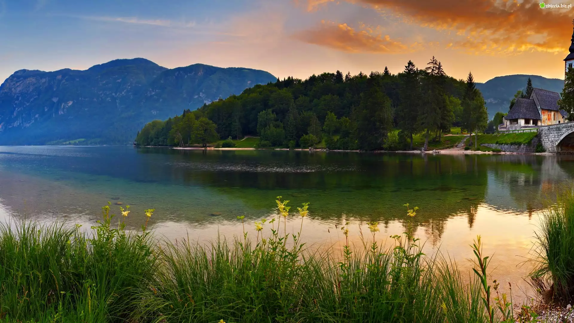 Zdjęcie, Rzeka, Góry, Las, Dom, Zachód słońca
