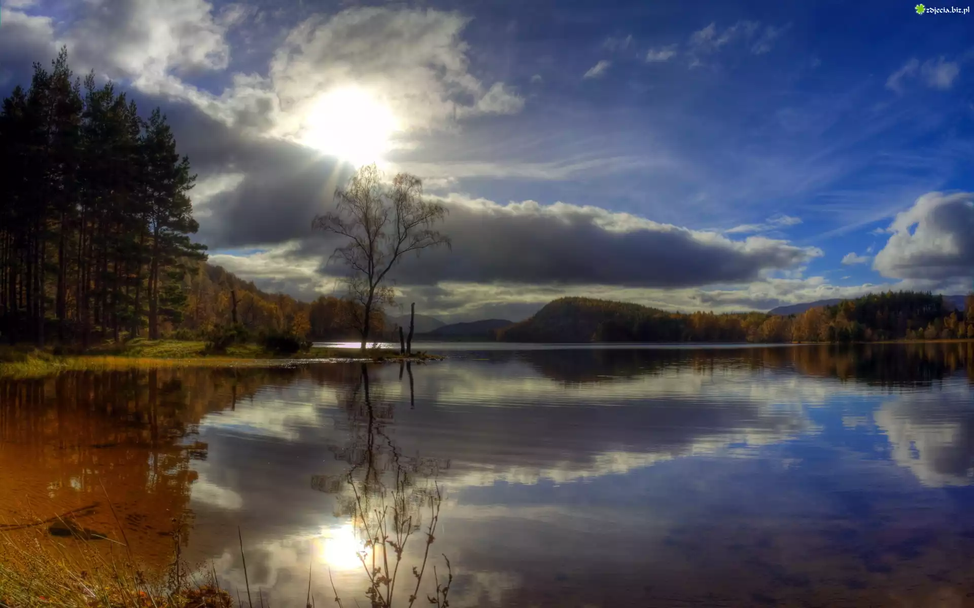 Zdjęcie Rzeka, Lasy, Chmury, Zachód, Słońca