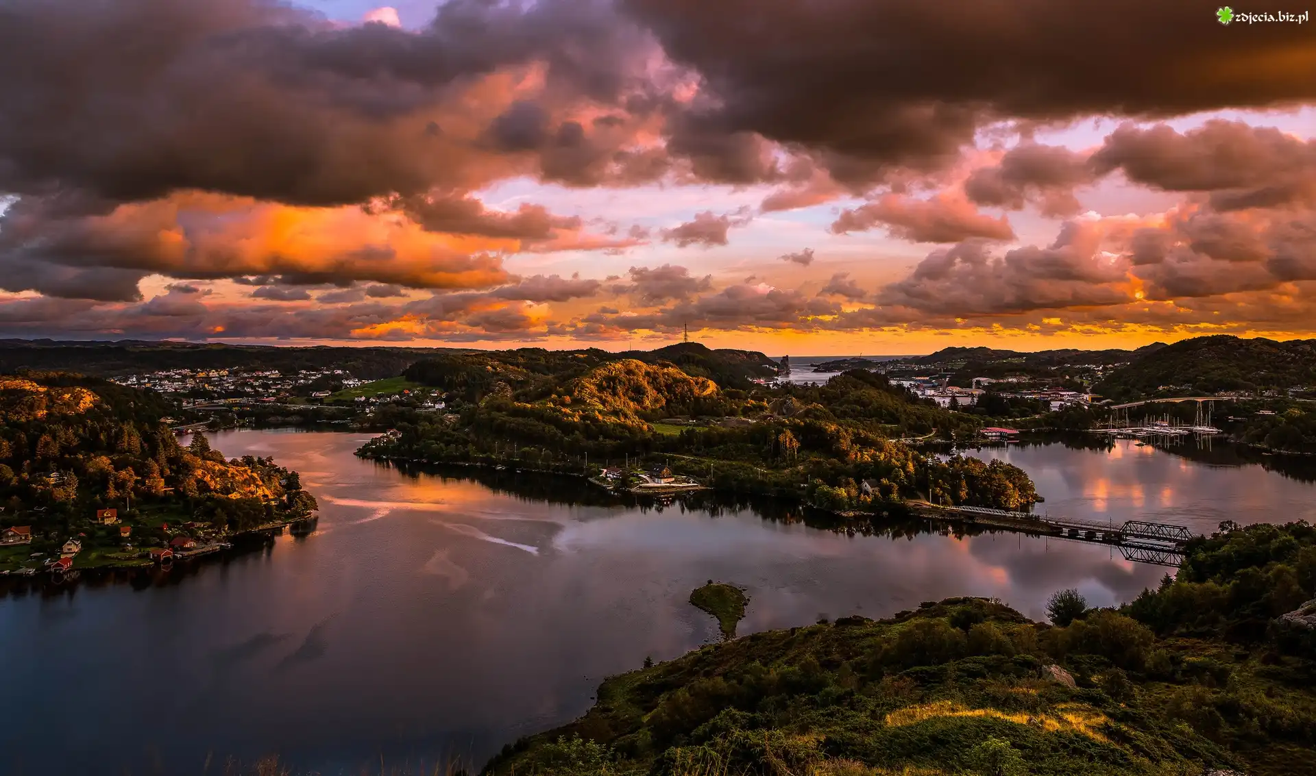 Zdjęcie Rzeka, Most, Wzgórza, Zachód Słońca, Egersund, Norwegia