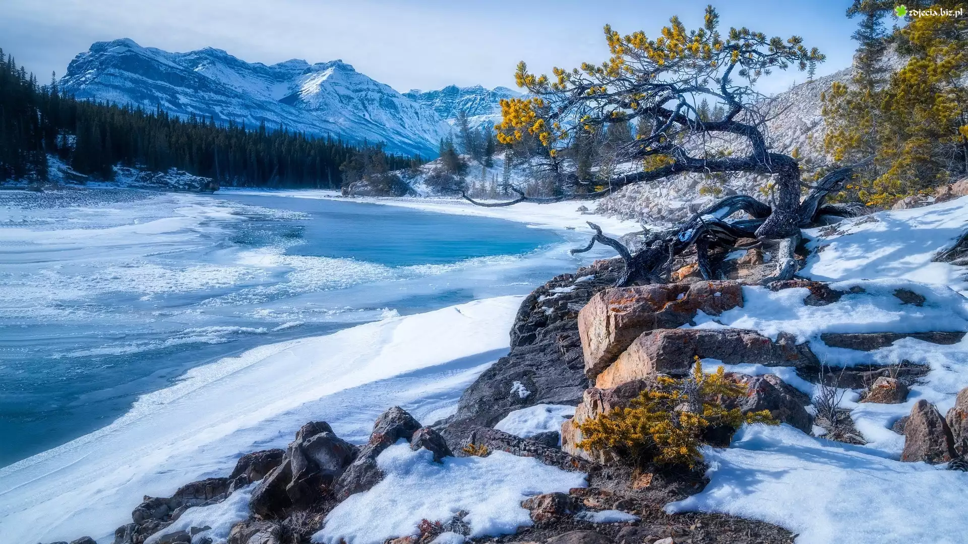 Zdjęcie Zima, Góry, Zaśnieżona, Rzeka, Skały, Drzewa, Sosny