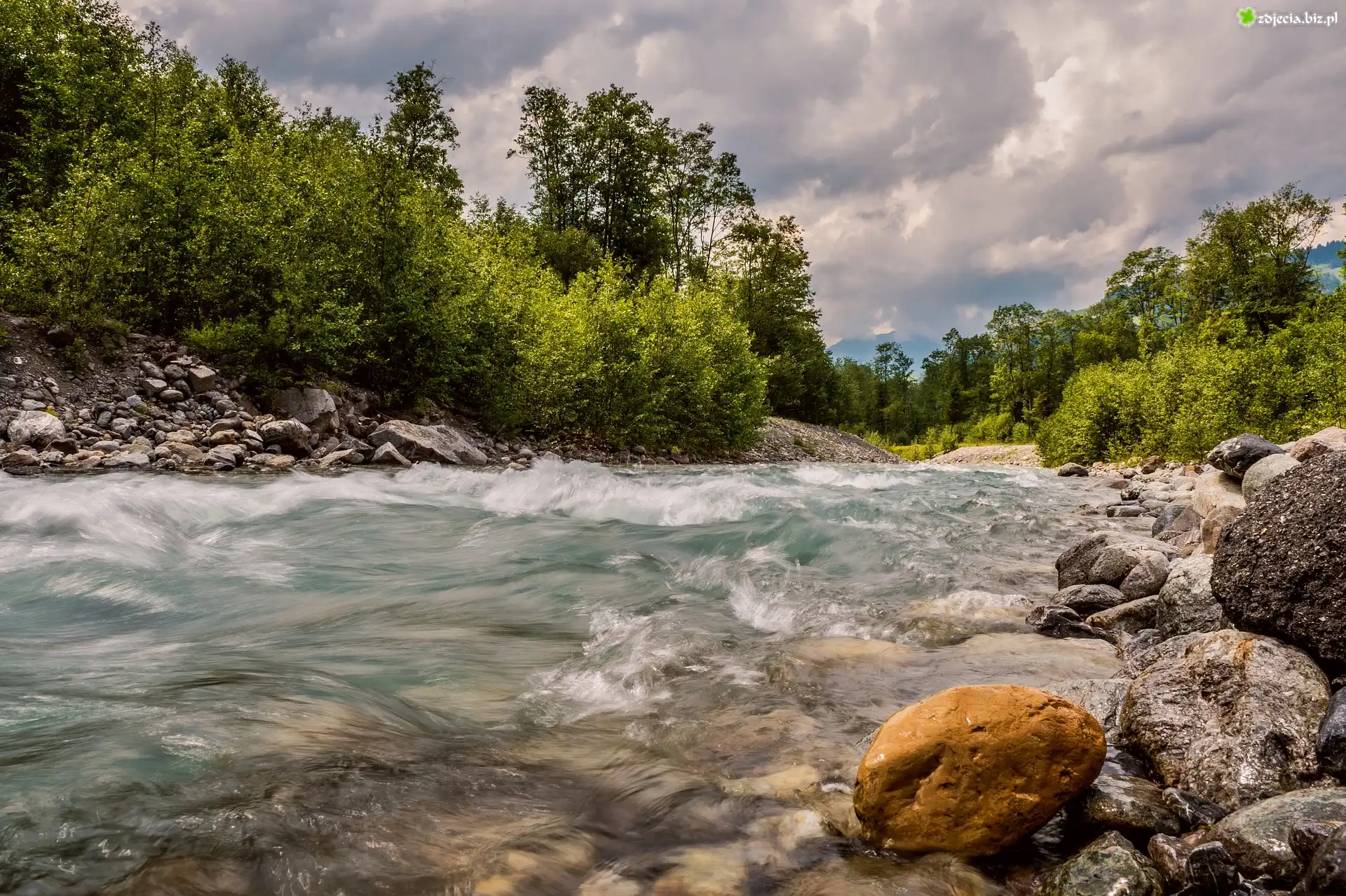 Zdjęcie Rzeka, Kamienie, Zielone, Drzewa