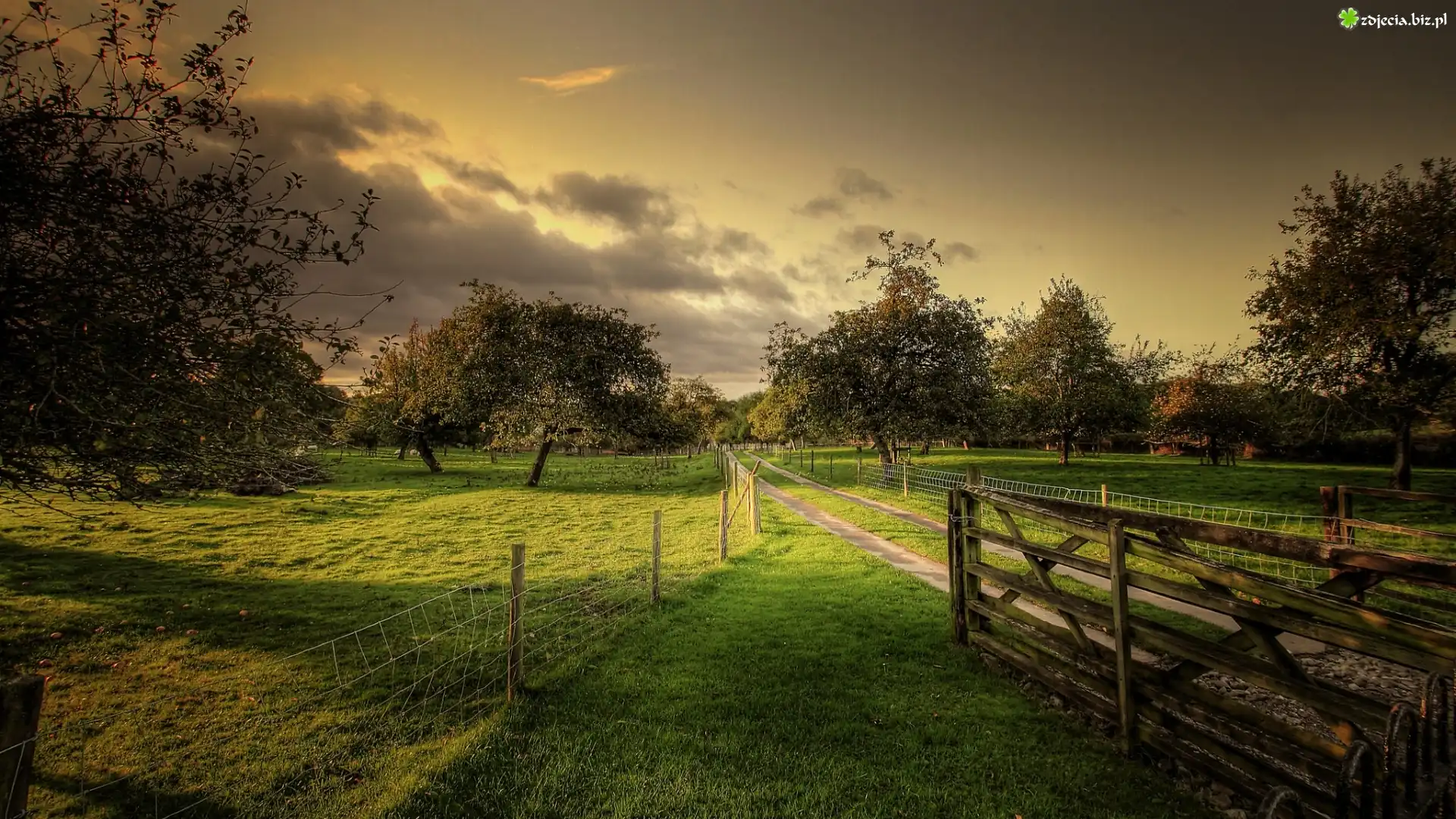 Zdjęcie Sad, Drzewa, Owocowe, Droga, Ogrodzenie