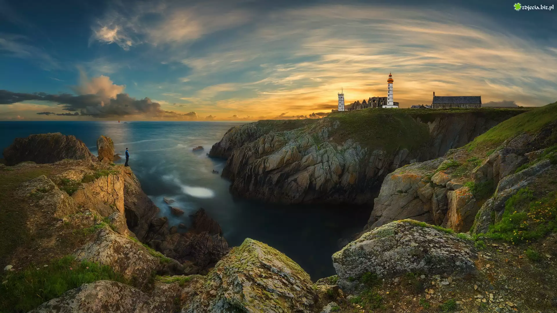 Zdjęcie Latarnia morska Saint-Mathieu, Morze, Skały, Zachód słońca, Plougonvelin, Bretania, Francja