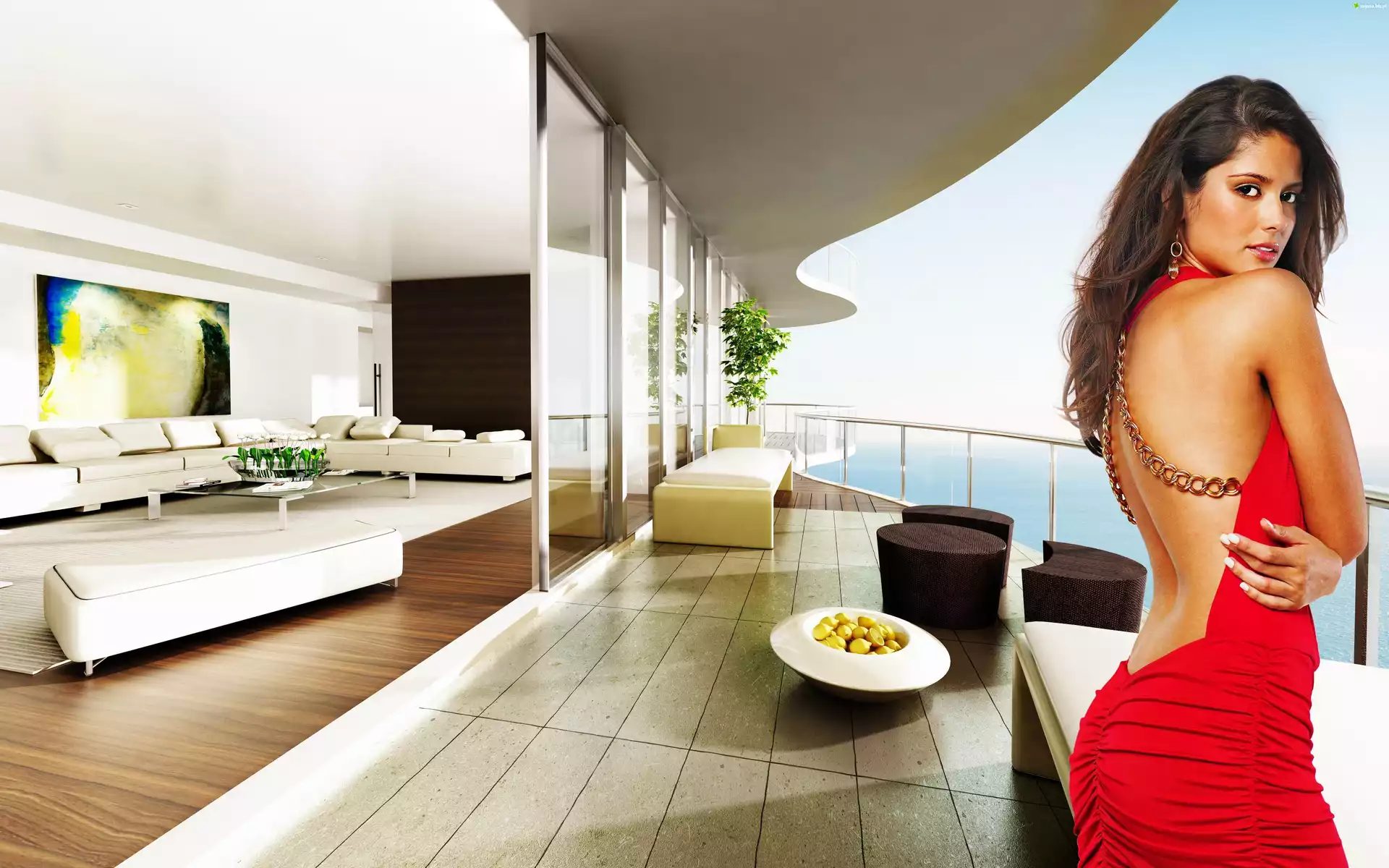 Zdjęcie Dom, Salon, Balkon, Ładna, Kobieta, Czerwona, Suknia