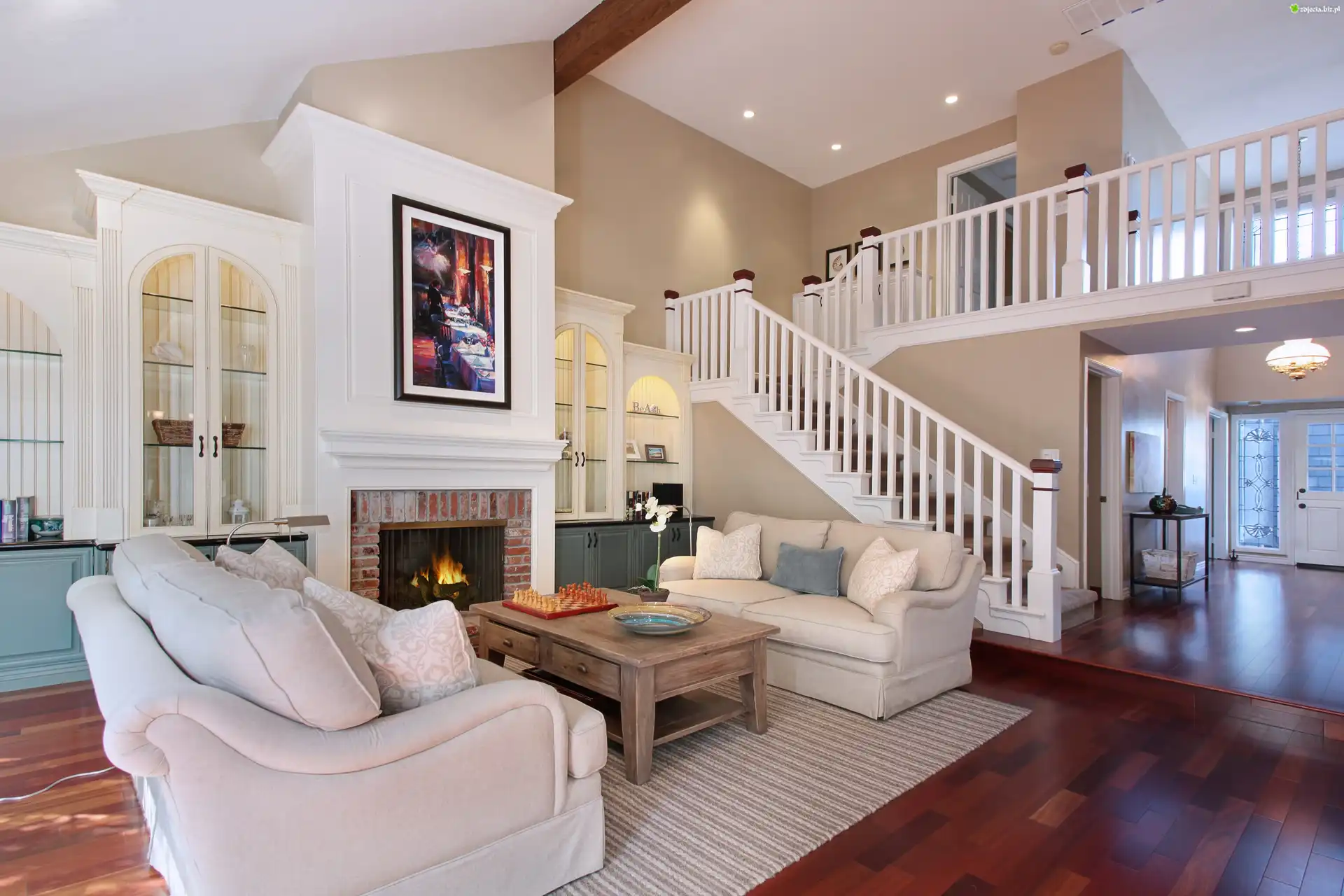 Zdjęcie, Salon, Jasne, Kanapy, Kominek, Schody