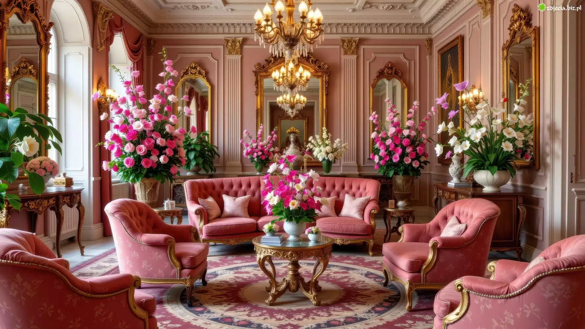 Zdjęcie Salon, Sofa, Fotele, Bukiety, Kolorowe, Kwiaty, Stolik, Dywan, Obraz, Lustra