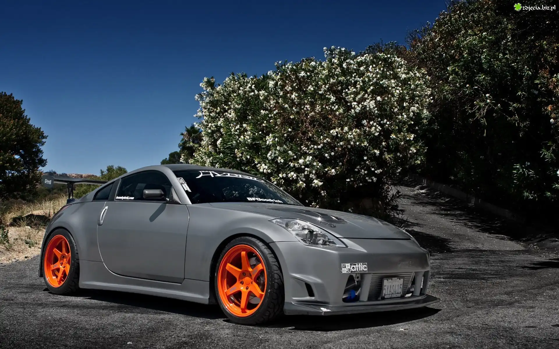 Zdjęcie, Samochód, Nissan, 350Z, Kwitnące, Drzewa