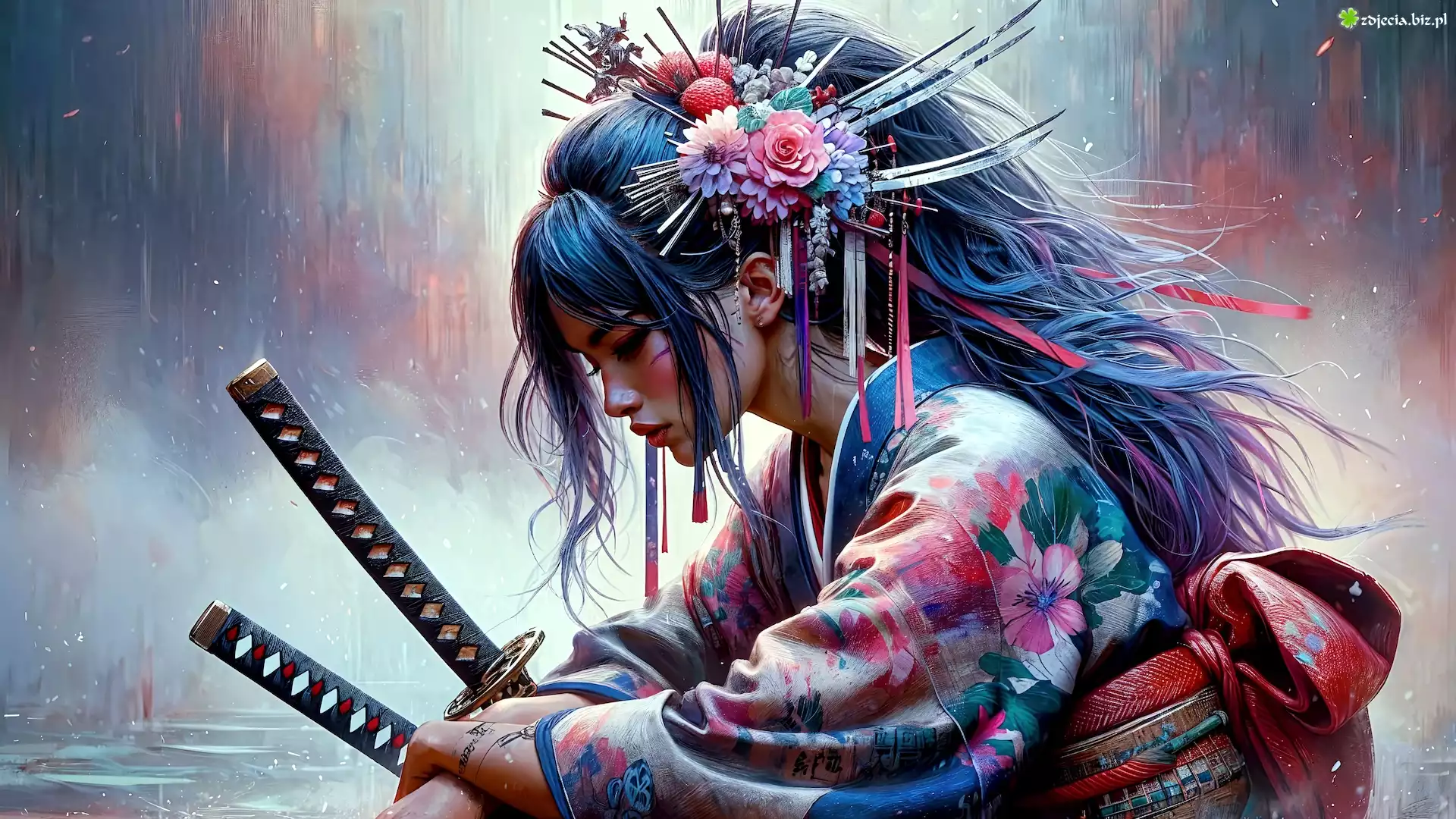 Zdjęcie Kobieta, Samurajka, Miecze, Kimono, Grafika