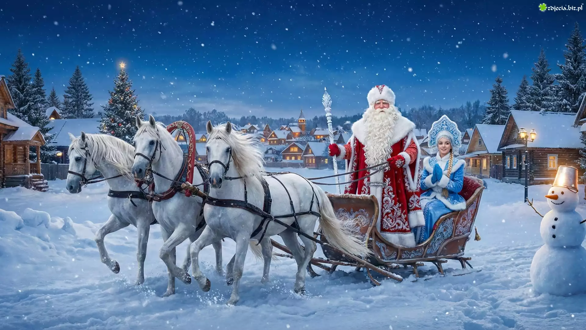 Zdjęcie Zima, Mikołaj, Śnieżynka, Sanie, Trzy, Białe, Konie