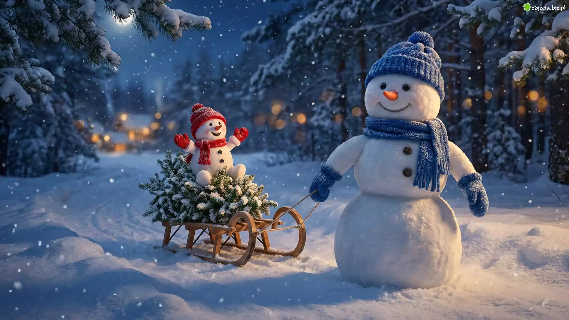 Zdjęcie Zima, Las, Bałwanki, Sanki