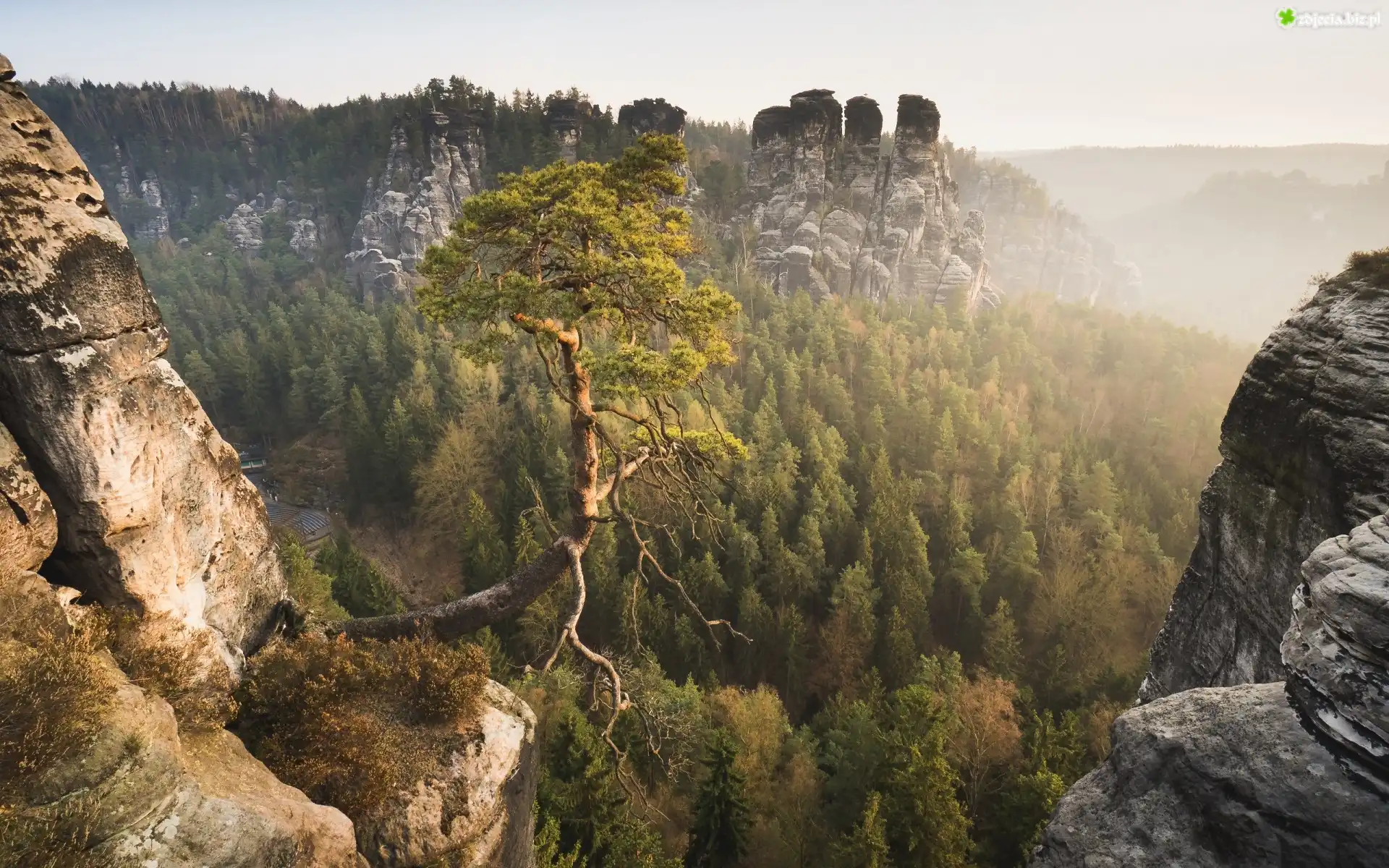 Zdjęcie Park Narodowy Saskiej Szwajcarii, Skały Bastei, Góry Połabskie, Lasy, Sosna, Niemcy